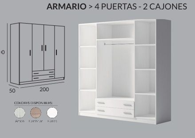Armario de 4 puertas de 200x200x50 con 2 cajones, estantes y barra de colgar.