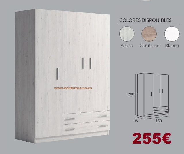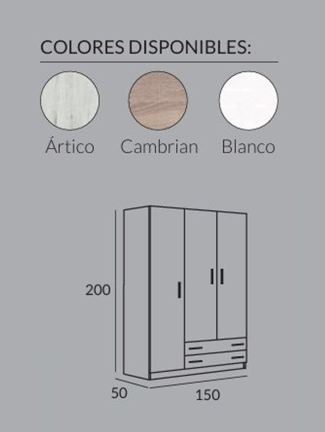 Armario de 3 puertas de 150x200x50 con 2 cajones, estantes y barra de colgar.