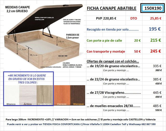 EL CANAPE ES DE 2,2cm de grosor el tablero, gran capacidad 28,5cm altura total 35 con tapa de acero tapizada en 3D transpirable con 5 colores a elegir.